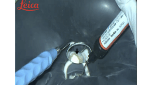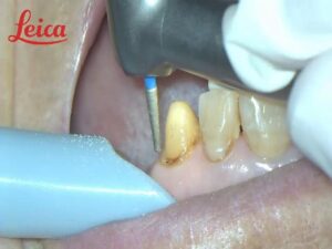 拡大視野での支台歯形成(差し歯の土台作り)です。差し歯などの被せ物が土台である歯とフィットするためには、歯の形や表面をできるだけ滑らかにする必要があります。段差などを極力残さないようにするには、マイクロスコープなどの拡大視野は非常に有効です。