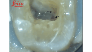 さらに倍率を上げ、先ほど見つけた箇所付近を詳しく確認します。写真中央にはっきりと見える「赤い点」(矢印)は、歯の神経の入り口から出ている血です。この小さなサインを正確に捉えることで、見落としのない処置が可能になります。