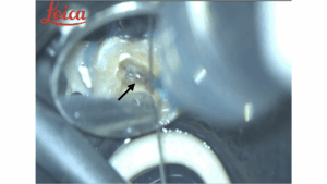 次に、歯科用顕微鏡(マイクロスコープ)で歯の内部を大きく映し出します。この段階の視野でも、歯の神経からの微かな出血が認められます(矢印部)。これが、処置すべき場所を見つける最初の目印となります。